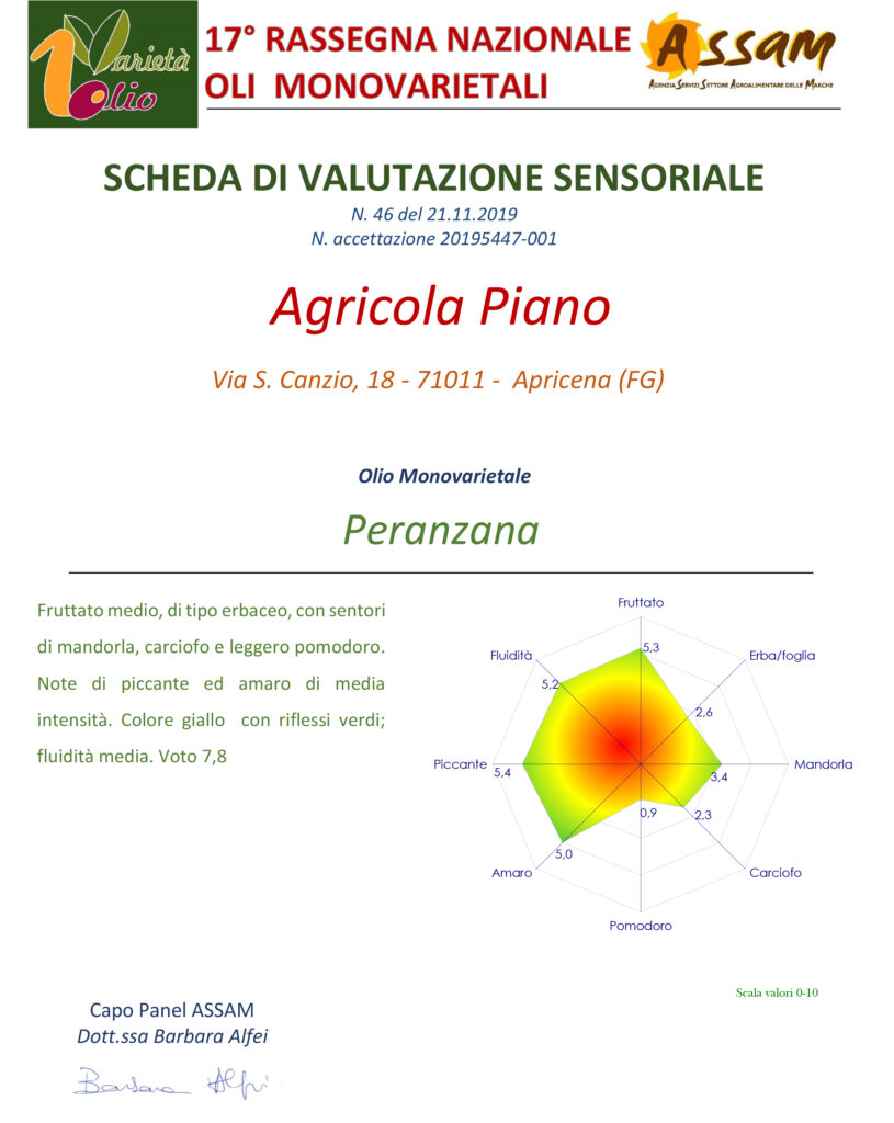Olio Extravergine Biologico da monovarietale Peranzana si è confermato ancora una volta tra gli oli di eccellenza italiani, ottenendo un punteggio di 7,4 su 9.