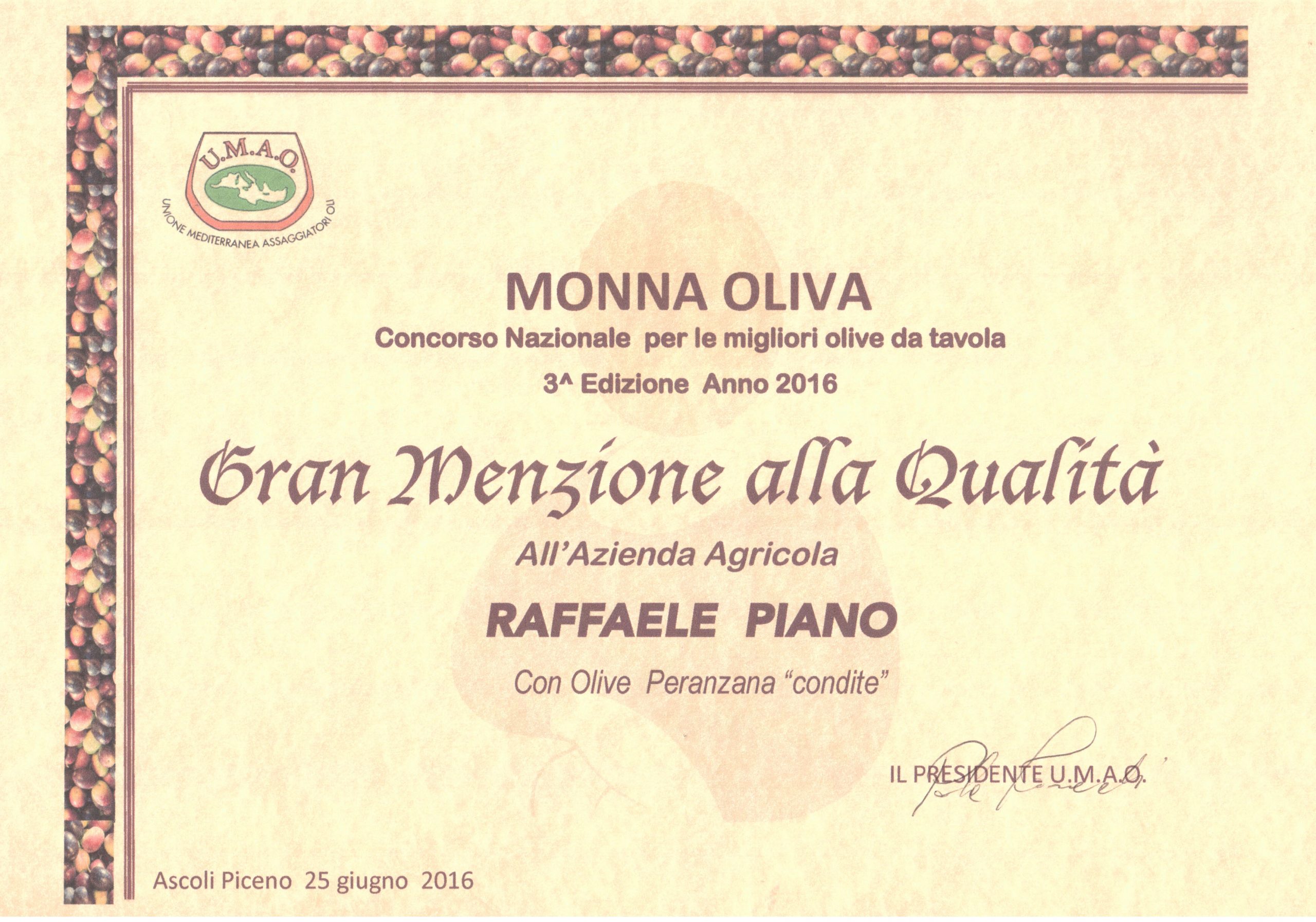 Olive Peranzana Piano Vincitrici al Concorso Nazionale Monna Oliva 2016 Anche quest'anno, per il terzo anno consecutivo, le nostre Olive Peranzana sono state premiate al Concorso Nazionale Monna Oliva 2016, che seleziona e individua le migliori olive da tavola italiane.