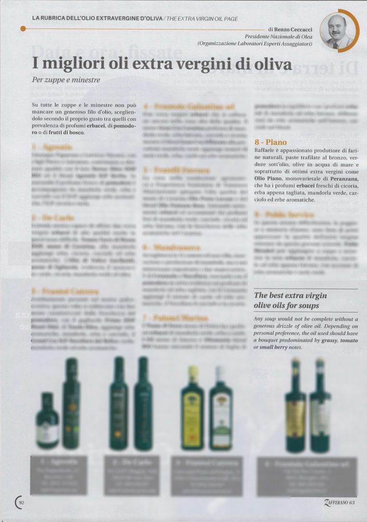 Il nostro Olio Extravergine di Oliva Bio Peranzana è stato riconosciuto da Zafferano Magazine 2019 come uno dei migliori oli extravergini per zuppe e minestre. Questo prestigioso periodico di ristorazione e gastronomia ha selezionato il nostro prodotto per la sua eccezionale qualità e le sue caratteristiche organolettiche uniche.