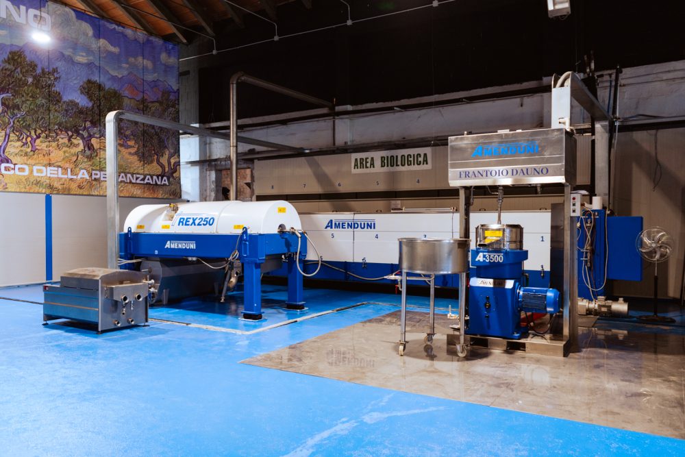 After malaxation in a controlled atmosphere, separation occurs through horizontal decanters that use centrifugal force to divide the components by density.