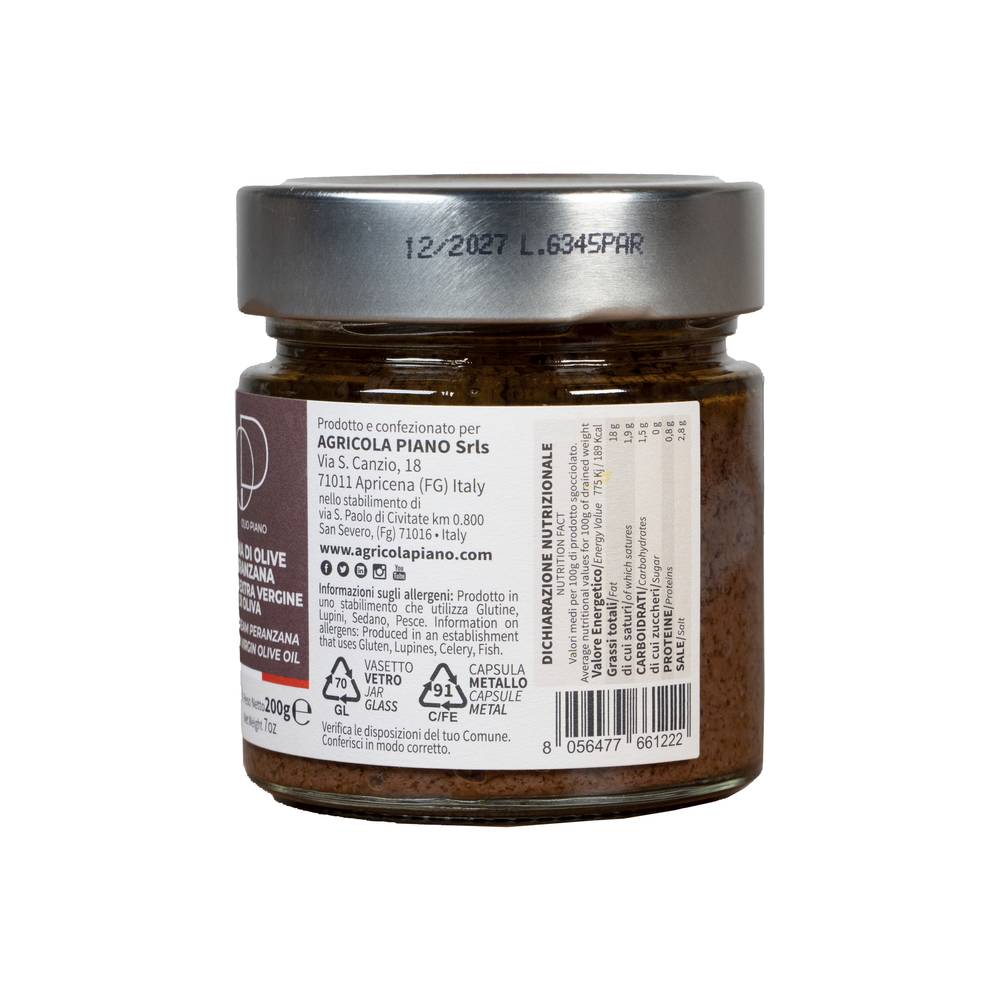 The Peranzana variety is a precious olive native to Puglia, with its fleshy pulp and the characteristic flavor that fades between notes of tomato leaf, freshly cut grass, almond, and floral. We use only the best Peranzana olives in our paté production, thus guaranteeing an authentic and rich taste. Furthermore, to further enhance the quality of our paté, we use our award-winning extra virgin olive oil. This oil, obtained from Peranzana olives, contributes to giving the paté a unique and valuable flavor, enriching its texture and aromas. The result is an extraordinary black olive paté, distinguished by the perfect combination of Peranzana variety and our award-winning oil. A blend of excellence that offers an unforgettable culinary experience, bringing the authentic taste of the Mediterranean to the table.