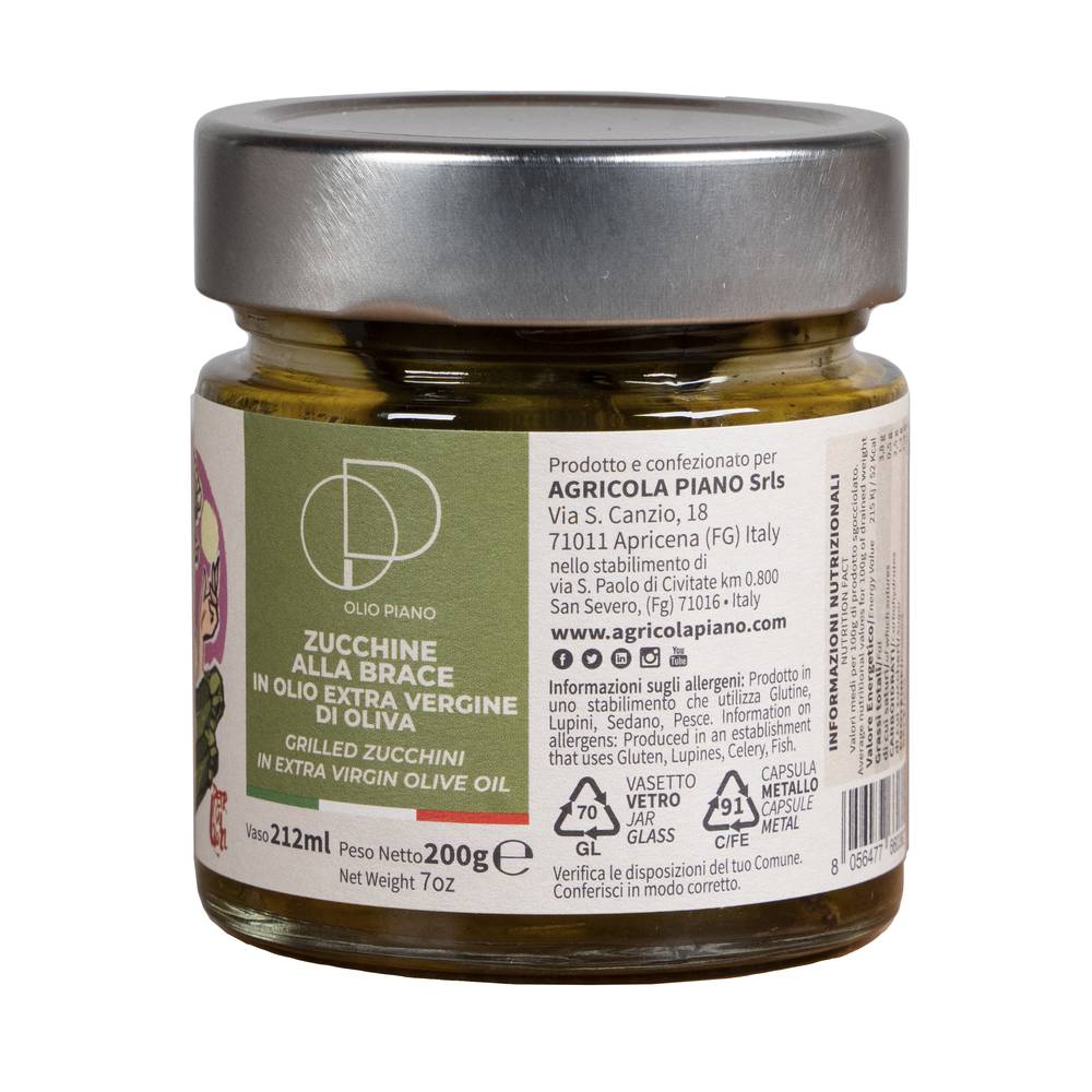 The extra virgin olive oil used for our grilled zucchini in oil is a product of excellence. The Peranzana olive variety, known for its aromatic characteristics and fruity taste, gives the zucchini a unique and unmistakable flavor. This oil has won multiple awards for its quality and is carefully used to enhance the flavor of the zucchini.